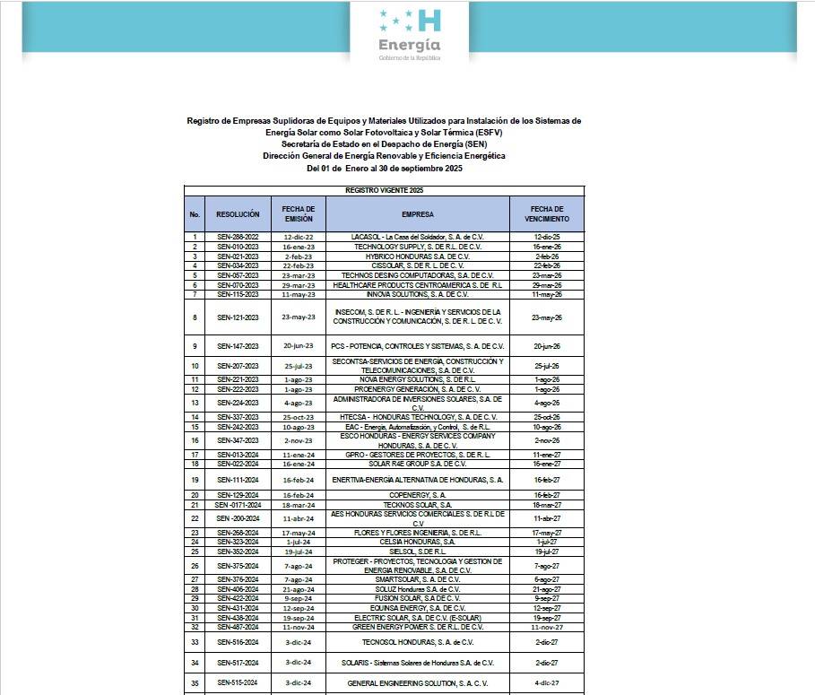 Empresas Suplidoras de Equipos y Sistemas de Energía Solar Fotovoltaica y Solar Térmica con registro vigente en la Secretaría de Energía de enero a septiembre del 2025 conforme al Acuerdo SEN 132-2023